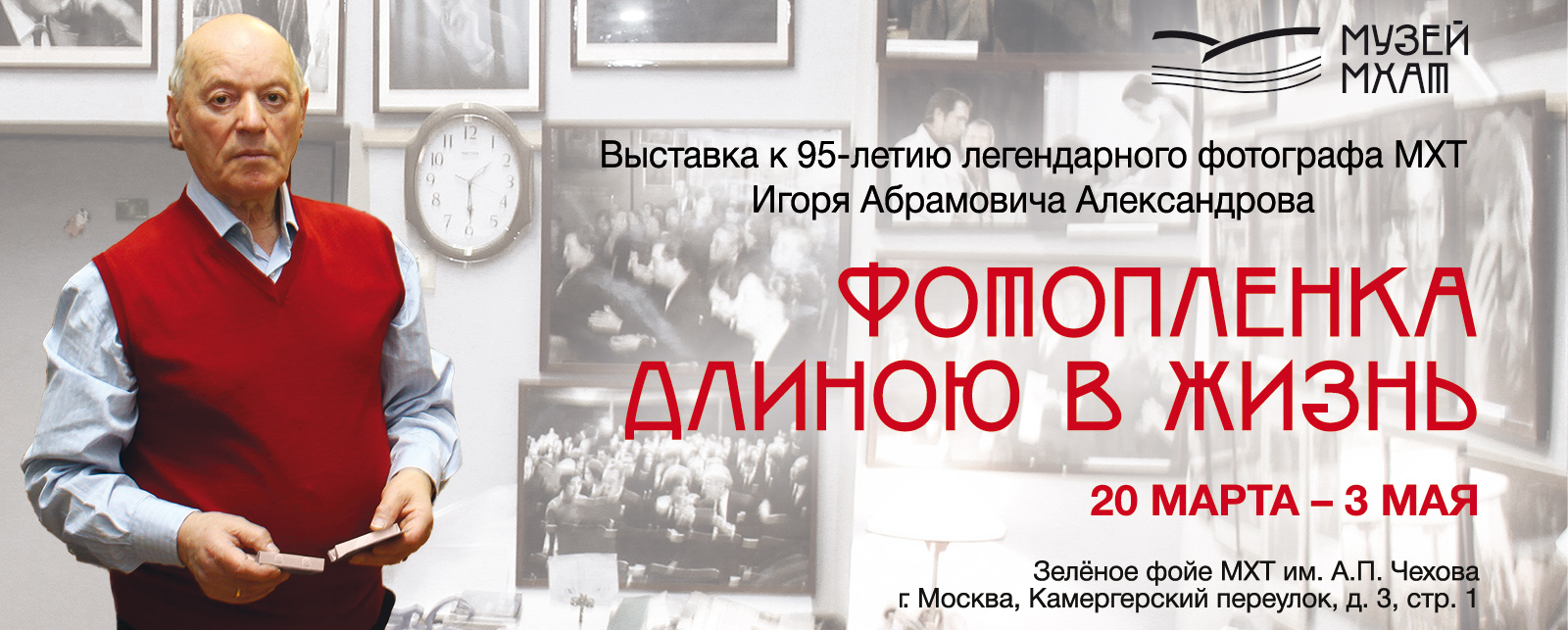 Выставка Музея МХАТ «Фотопленка длиною в жизнь», приуроченна к 95-летию легендарного фотографа Московского Художественного театра Игоря Абрамовича Александрова.